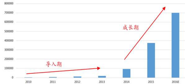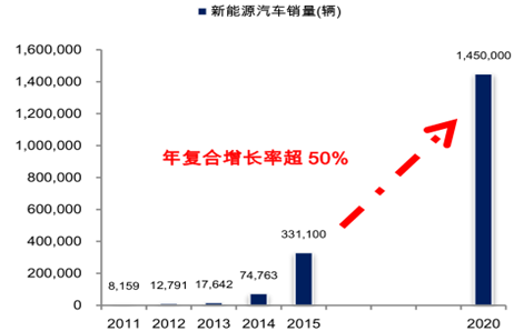 核心提示:根據工信部數據顯示,2015 年累計生產新能源汽車 37.90 萬輛同比增長 4 倍,銷售 33.11 萬輛,同比增長 3.4 倍,在全球新能源汽車超過 50 萬輛的年銷量中,中國市場的貢獻超過一半,中汽協2016 年 1-2 月數據顯示,根據工信部數據顯示,2015 年累計生產新能源汽車 37.90 萬輛同比增長 4 倍,銷售 33.11 萬輛,同比增長 3.4 倍,在全球新能源汽車超過 50 萬輛的年銷量中,中國市場的貢獻超過一半,中汽協2016 年 1-2 月數據顯示,新能源汽車銷量 3.57 萬輛,同比增長 1.7 倍,全年預計 60-70 萬輛,新能源汽車加速步入高速成長期。我國已經超越美國成為全球最大的新能源汽車生產國和消費國。政策規劃 2020 年累計銷量達 500 萬輛,復合增速 50% 以上:《節能與新能源汽車產業發展規劃(2012-2020 年)》指出 2020 年新能源汽車累計銷量達到 500 萬輛;同時,2015 年國務院下發《中國制造 2025》,明確提出到 2020 年我國自主品牌新能源汽車年銷量突破 100 萬輛,在國內市場占 70%以上,新能源汽車銷量達到 145 萬輛以上。