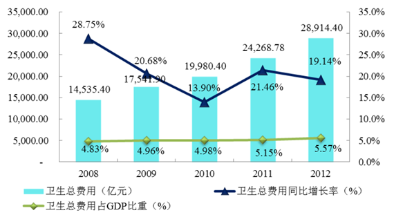 1)醫療信息化產業對于提高公共醫療衛生支出效率、防止社會醫療保障費用濫用具有重大意義隨著經濟發展水平的提高,世界各國的醫療衛生支出普遍持續快速增長。美國醫療衛生支出由2000 年的1.4 萬億美元增至2012 年的2.8 萬億美元,占當年GDP 比重由13.8%增至17.9%。我國醫療衛生費用從2008 年的1.5 萬億元增至2012 年的2.9 萬億元,年復合增長率達18.76%。據原衛生部2012 年發布的《“健康中國2020”戰略研究報告》顯示,2020 年我國醫療衛生費用占GDP 的比重將達到6.5%-7%。