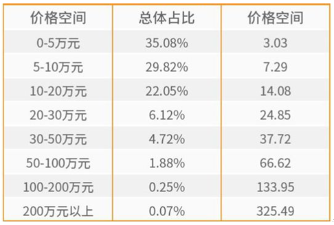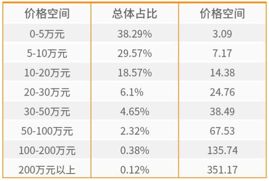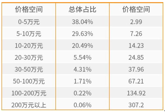 5萬元以下二手車雖然交易總量位居第一,但是占比下降,較多城市老舊車轉化到報廢而不進入交易階段的趨勢持續;5-10萬元庫存車交易量比較穩定,相對10-20萬元二手車的庫存增長,交易價格下降,性價比提升,成為目前二手供需活躍的價格空間;20-30萬元以及30-50萬元二手車庫存穩定,但是價格波動性大,主要是受到新車降價影響和新車型的沖擊比較大,因此這價格空間二手車于新車形成了對比競爭;50萬元以上二手車由于受到各種經濟形勢的影響,庫存占比和價格都呈現了持續下降的趨勢,預計這將成為持續效應,直到這個區域二手車價格穩定或經濟整體形勢樂觀。