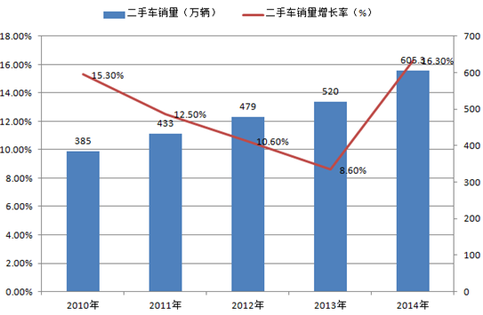 2010-2014年中國二手車銷量及銷量增速
