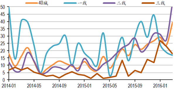 7、2016年3月,全國40大中城市土地溢價率39.44%,較上月上升。其中一線城市16.72%,二線城市53.07%,三線城市17.99%。