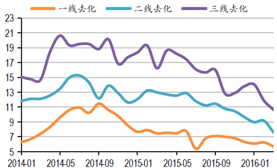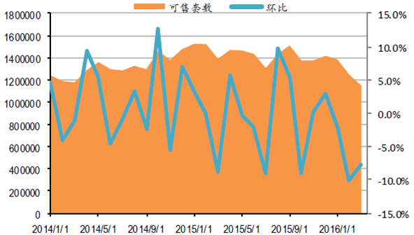 類別2016年3月2016年1-3月累計同比單月環比單月同比合計套數161,384328,148102.10%155.00%170.40%面積15,581,80531,457,114109.30%161.10%187.30%一線城市套數51,535115,378113.10%112.70%184.10%面積4,699,09710,438,741113.50%111.30%195.10%二線城市套數62,840127,58585.50%154.70%149.00%面積5,841,65411,847,75891.00%158.30%160.90%三線城市套數47,00985,185116.00%226.50%188.30%面積5,041,0549,170,615132.90%240.40%216.60%5、24大城市住宅可售套數合計114.9萬套,環比下降7.7%;去化周期8.5個月,較上月基本不變。一線、二線、三線城市住宅售套數合計分別為24.2萬套、35.6萬套、55.1萬套,環比分別下降6.8%、下降11.0%、下降6.0%;去化周期分別為5.8月、8.3月、11.0月,較上月分別呈現持穩、下降0.8月、下降0.2月,一城市的絕對庫存有所下降,去化周期不變,二、三線城市的絕對庫存及去化周期有所下降。