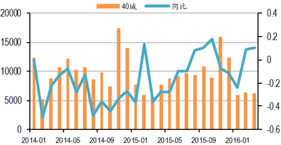 6、2016年3月全國40大中城市供應土地規劃建筑面積6165.1萬平方米,環比下降3.4%,同比上升10.0%;成交土地規劃建筑面積5420.9萬平方米,環比上升1.3%,同比上升16.8%,其中一、二線城市環比下降30.6%、下降13.1%,三線城市環比上升22.9%;成交均價環比下降2.9%,成交總價環比下降1.6%。