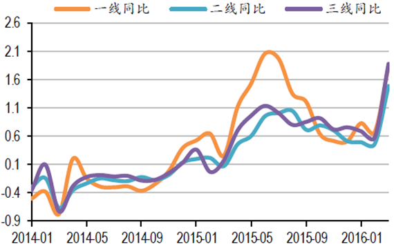 2、3月百城房地產均價11303元/平方米,環比上漲1.90%,同比上漲7.41%,共60個城市環比上漲,比上月減少1個城市。一二三線城市,環比分別上漲2.91%、上漲1.05%、上漲0.64%;同比分別上漲24.52%、上漲2.90%、上漲0.65%。