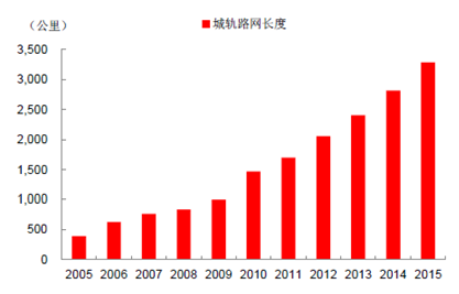 我國城市軌道交通通車里程數過去十年快速增長,年均復合增速達到25%:城市軌道交通作為新型城鎮化的重要內容之一,從2011年開始各地上報城市軌交項目大幅增加、發改委批復也在加速,城軌進入了大規模建設,地鐵車輛段的數量快速增加。根據中國城市軌道交通協會的統計,2015年新增加了南昌、青島、淮安這三個城市開通城軌線路;截至2015年末,我國累計有25個城市建成投運城軌線路111條,路網長度達3286公里,2005至2015年城軌里程數復合增速達到23.7%,從總投資上看,2014年全國城市軌道交通總投資達2899億元,2015年超過3000億元。從城軌主車廠商的業績上看,2015年中國中車城軌地鐵板塊實現銷售收入226億元,同比增長36%,實現地鐵銷售4024輛。相對于通車里程而言,由于老線路車輛密度不斷提升、出口訂單上升等因素,主車廠的城軌車輛訂單增速更高。