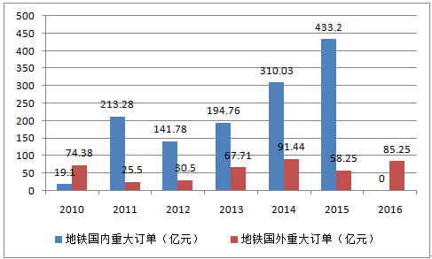 中國中車2010年-2016年地鐵新簽重大合同金額統計(2015年前為南北車合并數據)