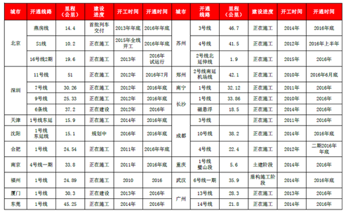 2、2011-2013年二三線城市集中批復和開建了大批地鐵項目,按照4年左右的建設期推算,未來2年將是城軌在建項目的集中開通高峰期。由于過去2年地方政府資金緊張,部分項目進度慢于預期,建設周期長于4年的在建項目累計達到了714公里,我們預計在貨幣寬松、PPP/BOT等新建設模式釋放、沿線物業開發完成、交通壓力倒逼等因素作用下,2016年-2017年在建城軌項目將迎來集中開通的高峰期。按項目拆分逐個統計,我們預測2016年城軌新通車里程有望達到760公里,而2017年將達到1022公里,兩年的同比增速分別高達62%和35%。