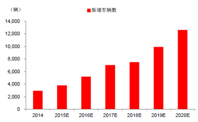 3、鑒于我們對于“十三五”期間城軌(不含有軌電車)年均通車里程900公里、比2015年翻一倍的預測,我們認為交付往新開通線路的城軌車輛也將出現顯著的高峰期,加上既有線路發車密度仍在不斷提升,未來幾年城軌車輛產業鏈將確定性進入爆發期。僅按照2020年通車8000公里計算(在建4000公里+目前規劃的約800公里),我們估算2016-2020年城軌車輛年均需求量將達到8500輛,較2015年上升約130%。如果考慮未來2年新開工的城軌項目在2020年前開通,2020年通車目標上調到9000公里,我們測算未來5年年均新車采購量有望達到接近1萬輛,較2015年上升約190%。