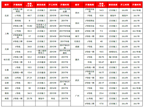 排名城市通車里程(公里)開通線路(條)車站數量(個)1上海628.64153692北京553.39183363廣州258.66101704南京24071375重慶197.2941216深圳177.5851317大連171.0371008天津147.4361009武漢126.03410210沈陽116.26613411杭州81.5635612成都88.4437013昆明6033514無錫5624615蘇州70.5335716西安5224017長春65.5448218哈爾濱17.7311819鄭州26.212020青島1211021長沙27.0512322淮安20.0712323南昌28.712424寧波49.2324225佛山14.78111總計-3286.141112257二三線城市進入地鐵普及時代,成為未來增長主要動力:2015年,各地發改委共發布了28個城市軌道交通項目可研報告批復,涉及南寧、南平、上海、成都、西安等19座城市。根據我們對各個城市軌道交通在建項目的統計,目前全國城市軌道交通在建里程數達到4070多公里,其中北京、上海、廣州、深圳、天津這五個一線城市目前在建規模達到1128公里。除了北京、上海、廣州、深圳這些“老牌”城市地鐵外,哈爾濱、重慶、成都、武漢、長沙、南昌等城市貢獻了主要增量,城市軌道交通建設已經由一線城市逐漸向二、三線城市擴展。隨著機動車保有量的迅速上升、城市主干道日益擁堵,以及房價快速上漲,地鐵逐漸成為二三線城市未來發展的重要一部分。從我們統計的主要城市軌交發展規劃來看,未來幾年計劃動工的軌交項目中二三線城市約占總里程的50%以上,其中,大多數城市集中在長三角、珠三角城市圈,以及各大區域中心城市,人口密度高、財政條件好。