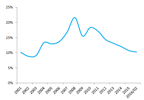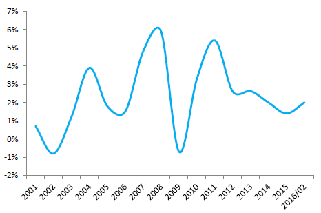 2001-2016年中國社會消費品零售總額累計增速
