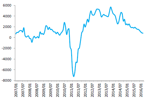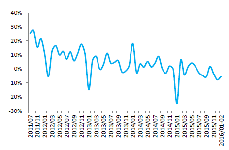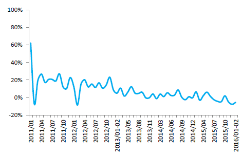 2011-2016年中國100家零售企業服裝零售額當月增速