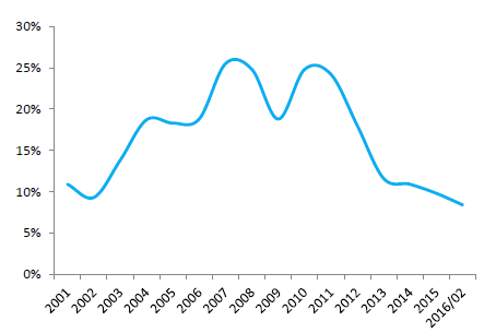 2001-2016年中國限額以上批零服飾類零售額累計增速