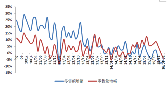 消費大環境仍較為低迷。統計局數據顯示,2015年社會消費品零售總額同比增長10.7%,較去年同期下降1.3個百分點;CPI同比上漲1.4%,較去年同期下降0.6個百分點;消費實際增速9.3%,較去年同期下滑0.7個百分點。2016年1-2月社會消費品零售總額同比增長10.2%,較去年同期下降0.5個百分點;1-2月CPI同比上漲2.0%。較去年同期增長0.9個百分點;消費實際增速8.2%,較去年同期下滑1.4個百分點。整體而言,消費景氣度仍然不高。