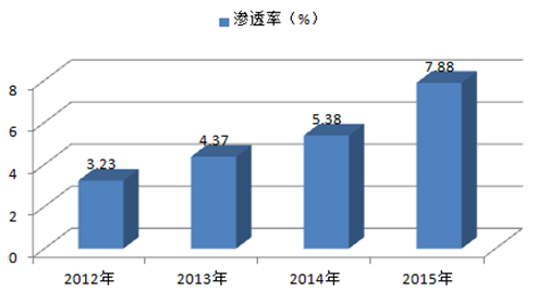 2012-2015年中國車聯網滲透率走勢