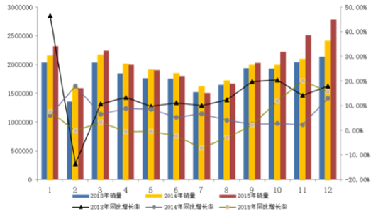 我國整車行業的持續穩定增長,為物聯網車載終端帶來了廣闊的市場。根據中國汽車工業協會統計,我國 2015 年累計生產汽車 2,450.33 萬輛,同比增長3.25%,銷售汽車 2,459.76 萬輛,同比增長 4.68%,其中乘用車產銷 2,107.94萬輛和 2,114.63 萬輛,同比分別增長 5.78%和 7.30%。2013-2015年月度汽車銷量及同比變化走勢