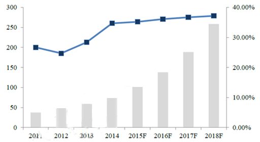2015-2018 年中國大數據市場規模預測(單位:億元)