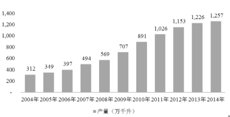 根據國家統計局公布數據,2004 至 2014 年,我國白酒產量由 312 萬千升增 長至 1,257 萬千升,年復合增長率為 16.75%。2012 年末以來,國家相繼出臺了“八項規定”、“六項禁令”等政策嚴格限制“三公消費”,高檔白酒的消費需 求明顯減少,白酒行業進入調整期。2013 年和 2014 年,我國白酒產銷量、白酒 行業收入增長等均有所放緩。