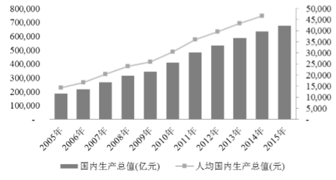 我國“十二五”期間 GDP 保持持續穩定增長,人均消費水平有望持續提高, 為白酒行業、特別是優質白酒企業的發展提供了良好的經濟環境。2005 年至 2015 年,我國國內生產總值穩定增長。