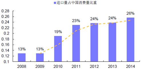 我國進口紅酒在市場總消費中占比不大,但是逐年上升。依據wind 數據庫數據統計可知,自2008 年至2014 年,進口紅酒占比從13%上升到26%。2002 年,上海葡萄酒的消費量10 萬噸,只有2000 噸是進口葡萄酒,可以忽略不計,但在過去11 年中,上海進口葡萄酒和國產葡萄酒的比例已經變成1:1的關系,消費總量達20 萬噸。