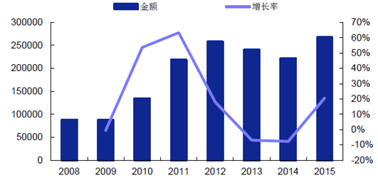 2008-2015年中國進口葡萄酒進口總額年度數據