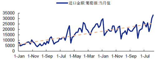 近年來,進口葡萄酒數量大幅上升。從下圖的統計中可以看出,進口金額成增長趨勢,同時具有較為明顯的周期性波動的特征。