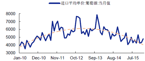 進口酒2012 年之后下降,與我國限制三公消費政策的出臺相關,同時前期一些傳統運行模式下的代理商可能由于庫存積壓,銷售不暢等原因倒閉,這也為依托模式創新而產生、發展起來的上酒所提供了更好的發展空間。2015 年,葡萄酒進口值增長率觸底反彈,我國紅酒市場迎來了較好的發展周期。從進口價格來看,近年來紅酒單價先增后降,這與我國紅酒逐漸規范化、稅率優惠等政策的支持有著緊密的聯系。