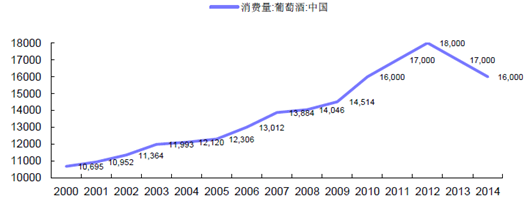 排名地區數量(升)金額(美元)1山東省854199665411128692河北省30478206170966073廣東省428312074698974上海市836060468807585福建省317670831412316江蘇省606734430990177天津市425770129836678北京市243020117886199浙江省45682649703610新疆576000467672從紅酒國內消費情況來看,近年來紅酒消費總體趨勢上升,2012 年之后受三公消費情況影響,2013、2014 年度略有下降。