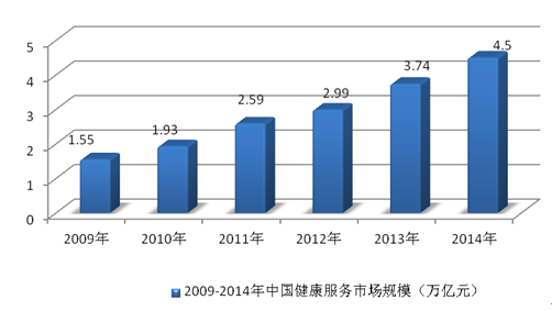 2013年我國健康服務產業市場規模約3.74萬億元,到2014年我國健康服務產業達到了4.5萬億元,近幾年我國健康服務產業市場規模情況如下圖所示: