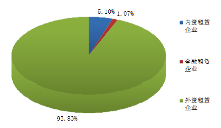 從監管部門的角度劃分,目前我國租賃行業已形成金融租賃公司、外商租賃公司和內資試點融資租賃公司三足鼎力的市場格局。我國金融租賃公司多數是銀行投資成立,由銀監會監管。外商租賃公司則是由中外合作出資或外商獨立出資成立,歸商務部外資司監管。內資租賃公司是國內企業投資設立的,是由商務部市場建設司和國家稅務總局聯合監管。近幾年三類租賃公司實現快速增加。截至2015年底,金融租賃、內資租賃、外資租賃三類融資租賃企業總數為4508家,比2014年底的2202家增加了2306家。其中金融租賃、內資租賃、外資租賃占比分別為:1.07%、5.10%和93.83%。