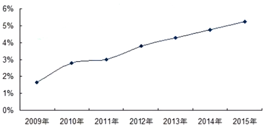 2009-2015年中國融資租賃市場滲透率變化趨勢