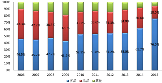 從全球市場份額的變化來看,2006 以來單晶的市場份額逐年下滑,從 06 年的歷史峰值 43.3%下降至 2015 年的 18%。在 2008 年開始光伏產業快速增長的過程中,多晶硅以其低價和產能優勢快速占領國內中低端市場。