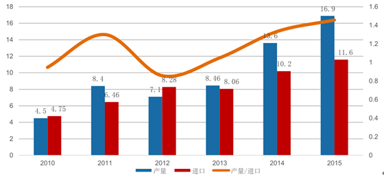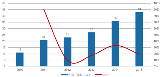 光伏產業鏈的上游主要是太陽能級晶硅的制造,我國多晶硅產業在光伏產業迅猛發展的勢頭下快速成長起來,在經過大規模的收購兼并后,多晶硅行業集中度持續上升。隨著行業發展產業集中度逐步提升,截止 2015 年底,國內在產對多晶硅企業僅剩 13 家。整個多晶硅行業呈現高端產能不足但整體產能過剩的格局, 國內多晶硅企業由于行業產能過剩嚴重所導致產品價格持續下降,多數處于虧損狀態。2015 年我國多晶硅產量 16.9 萬噸,同比增長 24.3%。