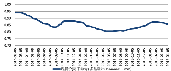 2015 年上半年在具體補貼政策尚未明朗的情況下,光伏裝機推進緩慢、需求疲軟,硅片價格一路下滑。156mm 多晶硅片單價從 1 月初的 0.87 美元/片緩慢下滑至六月底的0.80 元美元/片,跌幅為 8%;隨后光伏市場逐漸回暖,硅片價格一路溫和回漲至 12 月底的 0.86 美元/片。