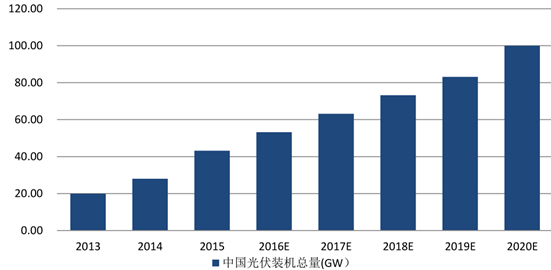 根據十三五規劃未來5年我國光伏總裝機量預測