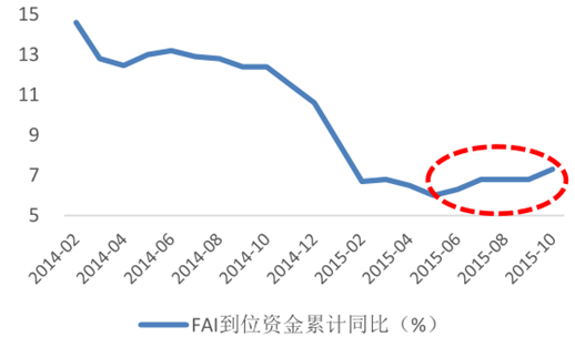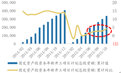 2015年10月固定資產(chǎn)投資到位資金累計(jì)同比為7.3%,高出9月0.5個(gè)百分點(diǎn),表明資金面的緊張狀況較之前有所緩解。固定資產(chǎn)投資新開(kāi)工項(xiàng)目計(jì)劃總投資額累計(jì)同比連續(xù)6個(gè)月回升,10月為4.1%。