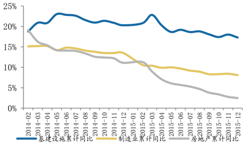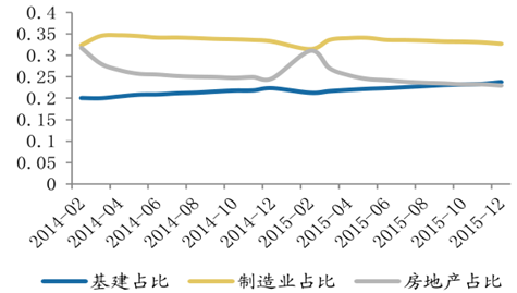2015 年固定資產(chǎn)投資中, 基建投資占比達(dá)到 23.8%, 制造業(yè)投資占比為 32.7%,房地產(chǎn)投資占比為 23.0%,而基建投資 2015 年同比增長(zhǎng)率為 17.3%,制造業(yè)固定資產(chǎn)投資同比增長(zhǎng)率為 8.1%,房地產(chǎn)投資固定資產(chǎn)同比增長(zhǎng)率為 2.5%,其他固定資產(chǎn)投資同比增長(zhǎng)率為 14.2%。