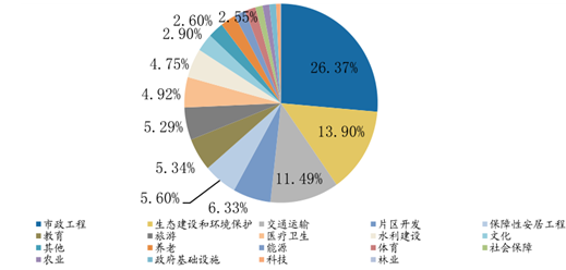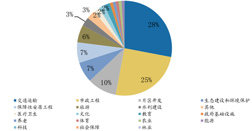 項(xiàng)目數(shù)量最多的 5 個(gè)行業(yè)分別為市政工程 1875 個(gè),生態(tài)建設(shè)和環(huán)境保護(hù) 988個(gè), 交通運(yùn)輸817個(gè), 片區(qū)開(kāi)發(fā)450個(gè), 保障性安居工程398個(gè), 占總項(xiàng)目的63.68%。