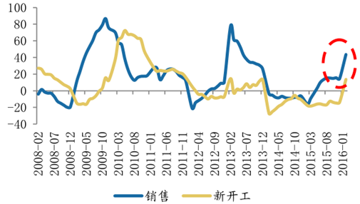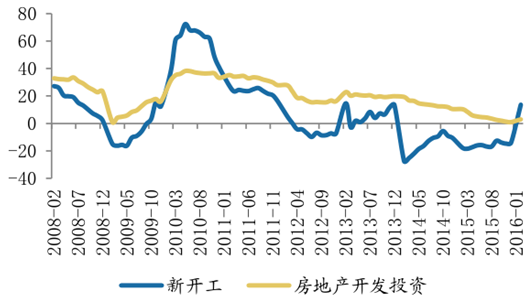 首先,在房地產(chǎn)固定資產(chǎn)投資變化方面,對(duì)比房地產(chǎn)銷售額速度變化,房地產(chǎn)新開(kāi)工面積速度變化有明顯的滯后效應(yīng):房地產(chǎn)銷售額速度發(fā)生變化以后,房地產(chǎn)新開(kāi)工面積增速才會(huì)做出同方向變化。而且,房地產(chǎn)銷售額有明顯的周期性,房地產(chǎn)銷售額與新開(kāi)工面積今年將處于上升周期。而房地產(chǎn)投資新開(kāi)工面積增速往往與房地產(chǎn)開(kāi)發(fā)投資、房地產(chǎn)固定資產(chǎn)投資額增速有正相關(guān)關(guān)系,因而預(yù)計(jì)2016年房地產(chǎn)固定資產(chǎn)投資增速將有回暖。