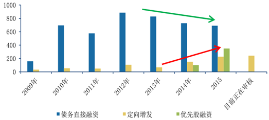 2015年前11月滬深兩市定增的募集資金為9218億 ,遠(yuǎn)超過(guò)2014年的6824億,可見(jiàn)我國(guó)資本市場(chǎng)融資功能逐漸增強(qiáng) 。就建筑行業(yè)而言,債務(wù)直接融資量繼續(xù)下降 ,偏好定向增發(fā)的企業(yè)越來(lái)越多。2016年定增募集金額已為歷年最高,另外還有242.35億的定增方案正在審核之中(如果考慮349億的優(yōu)先股融資就達(dá)到了591億)。2016年建筑行業(yè)定增融資將持續(xù)增加,資本市場(chǎng)將為建筑企業(yè)并購(gòu)轉(zhuǎn)型提供強(qiáng)有力的支撐。