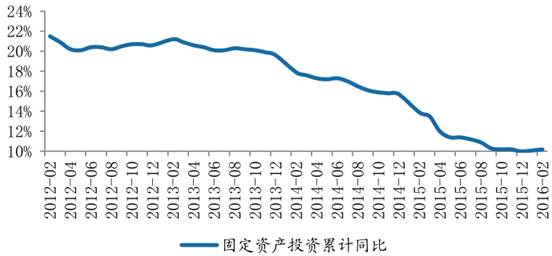 受經(jīng)濟(jì)下行壓力加大以及房地產(chǎn)投資增速降低等因素影響,固定資產(chǎn)投資增速自 2013 年開(kāi)始持續(xù)下降,2015 年固定資產(chǎn)投資同比增速達(dá)到 10%。而最新數(shù)據(jù)顯示,2016 年 2 月累計(jì)同比小幅上升,達(dá)到 10.2%。