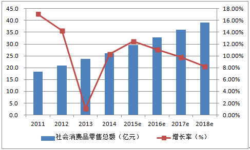 2011-2014年中國社會消費品零售總額從18.4萬億元增長至26.2萬億元,年增長率保持在10%以上。未來幾年內,中國零售市場整體發展環境較好,社會消費品零售總額或將繼續平穩上升,2016年數值有望突破30萬億,2018年數值或將接近40萬億。
