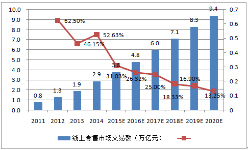 2011-2020年中國線上零售市場交易額預測
