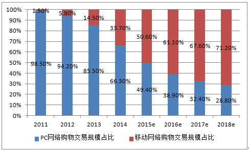 2011-2018年中國網購交易額PC端和移動端占比預測