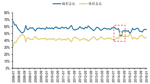 分彩種來看,福彩的銷售量略大于體彩,彩票銷售總額中福彩所占比例一般在 55%左右,體彩占比約為 45%,但是二者的差距有縮小的趨勢。2014 年 6月、7 月體彩銷售額超過福彩,2014 年 6 月體彩、福彩的銷售額分別為 192.4 億元和168.1 億元,2014 年 7 月體彩、福彩的銷售額分別為 197.8 億元和 174.3 億元。2014 年 6 月、7 月是巴西世界杯的舉辦時間,比賽時間為 6 月 13 日至 7 月 14日,受到世界杯賽事催化,我國體彩的銷售額在當(dāng)年的 6/7 月份實現(xiàn)了快速增長。福彩銷售的波動變化較小,增速的波動幅度較為穩(wěn)定,體彩由于易受到重大賽事的影響, 在重大賽事發(fā)生的月份體彩銷售額的同比增長率可以達(dá)到 100%。