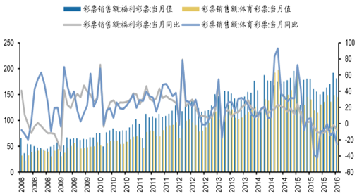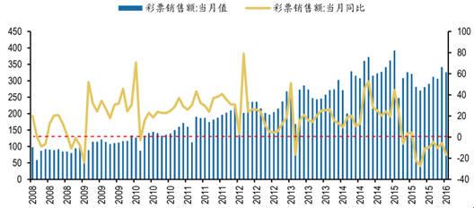 按月份來看,2015 年 2 月 28 日,財政部、民政部和國家體育總局聯(lián)合下發(fā)了《關(guān)于開展擅自利用互聯(lián)網(wǎng)銷售彩票行為自查自糾工作有關(guān)問題的通知》 ,拉開了互聯(lián)網(wǎng)彩票行業(yè)整頓的序幕。2015 年 3 月彩票銷售遭遇滑鐵盧,同比增速僅為-6.27%,相比于 2 月大幅下滑約 30 個百分點(diǎn)。2008 年至今個別月份出現(xiàn)過彩票銷售額下滑的情況,但從未出現(xiàn)過彩票銷售額連續(xù)下滑的情況。