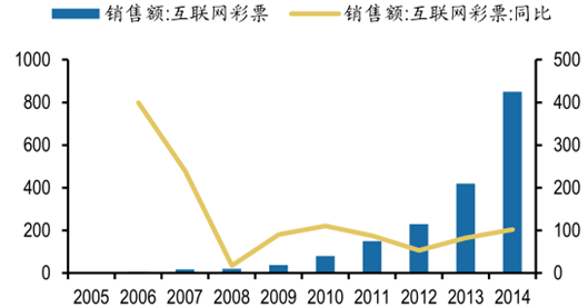 互聯(lián)網(wǎng)售彩起步于 2001 年,2014 年行業(yè)滲透率已經(jīng)達(dá)到 22.2%,行業(yè)規(guī)模達(dá)到 850億元左右,同比增長 102.4%。