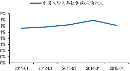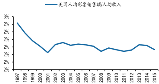 2015 年我國人均可支配收入僅為 21966 元,距離臨界值尚有 1 倍左右的空間。2012年~2015 年我國人均可支配收入增速在 8.9%~13.5%之間, 按照 13.5%的增長速度測算,我國人均可支配收入達(dá)到臨界值尚需要 6 年時間。過去 15 年,美國人均彩票銷售額占個人人均收入的比例較為穩(wěn)定,在 2.03%~2.16%之間波動。