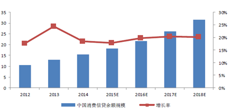 2012-2018年中國消費信貸余額市場規模(單位:萬億元)