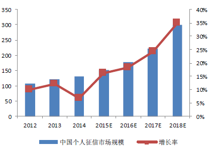 由于個人征信牌照未發放等原因,近年來我國的個人征信市場發展緩慢。2015年,我國個人征信行業的實際市場規模約為151億元,未來隨著互聯網金融的發展和消費金融的持續升溫,尤其是類型多樣的個人征信應用快速發展,中國的個人征信行業將迎來爆發式增長,預計2016年將達179億元,2018年將達300億元。