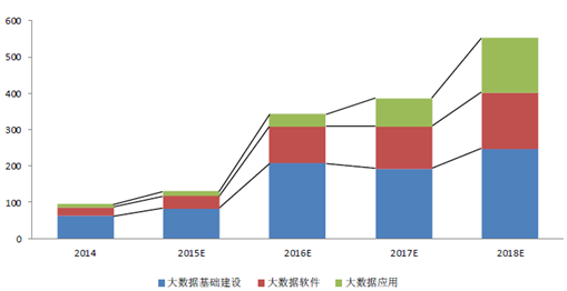 2、通信大數據2015年既已完成破局,2016年必將揚帆起航進入實質性商業階段。尤其隨著十三五期間“國家大數據戰略”的深入推進,通信大數據市場將迎來飛躍。我們預計,2016年通信大數據產業市場規模將達342億元,較2015年增長163%,其中大數據基礎設施占比60.5%,市場規模將達207億元,大數據軟件占比29.5%,市場規模將達101億元,大數據應用占比10%,市場規模將達34億元。2014-2018年中國通信大數據產業及細分領域的市場規模(單位:億元)